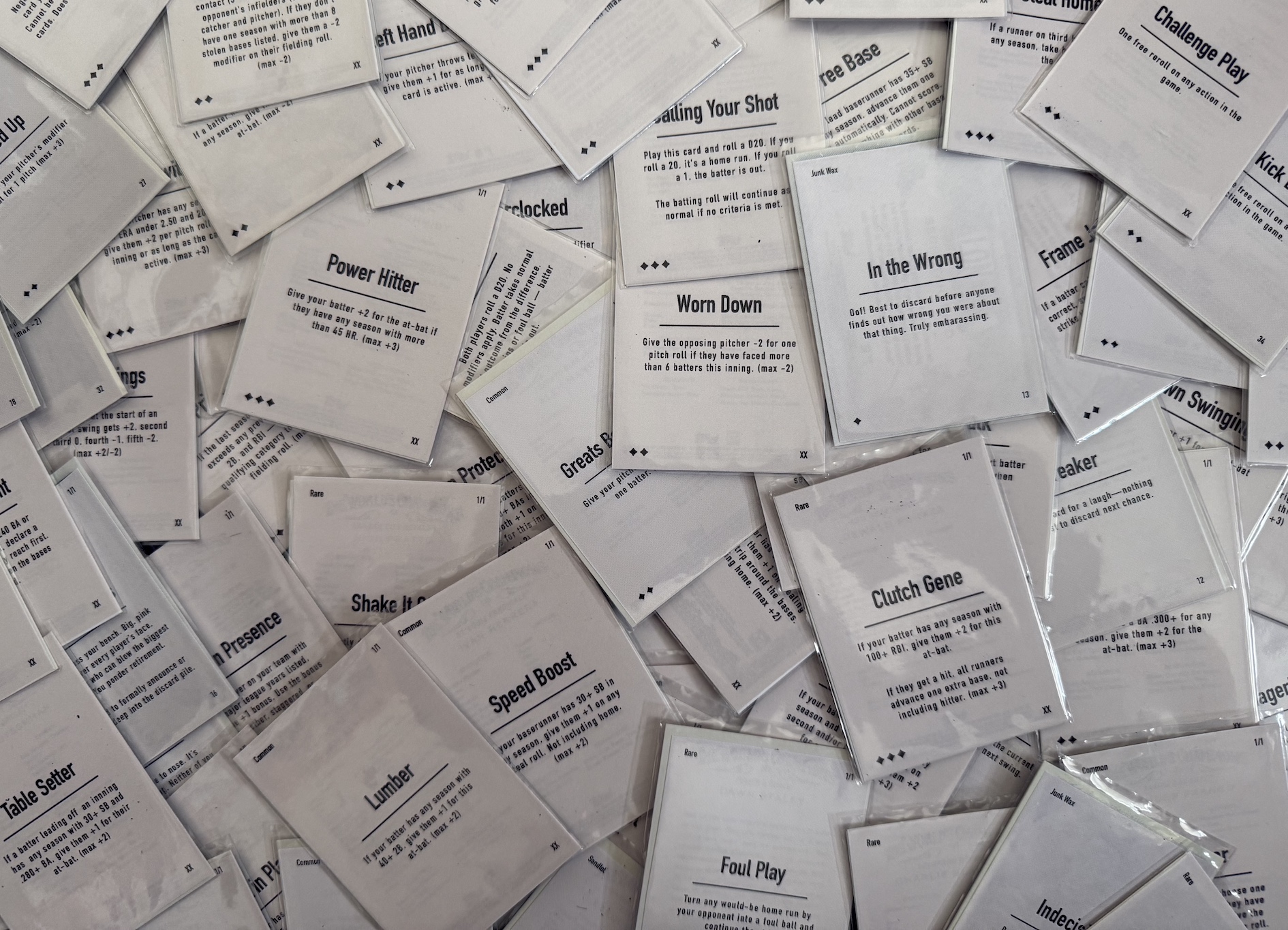 Manager Cards — Each player starts with 4 cards and maintains a hand of 4, active or in hand. Cards stay face-up until the end of the half inning even if the effect has already resolved. A card must be active for at least one pitching, batting, or fielding roll to be discarded, otherwise it is returned to the player's hand. At the end of each half inning discard any number and draw back up to 4. Never discard mid-inning unless a card forces it. A card deactivated while its effect is still in play reverses the effect unless stated otherwise. If the deck runs out shuffle the discard pile into a new draw pile.